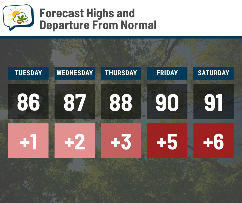 Highs the next few days will be pretty run-of-the-mill. Our normal high all week is 85, and we’ll be close to that until we get toward the holiday weekend. Afternoon readings ought to be closer to 90 then.