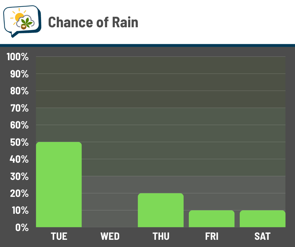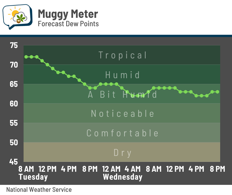 Dew points stay in the lower to middle 60s the rest of the week, which is pretty reasonable for this time of year and lower than they were last week.