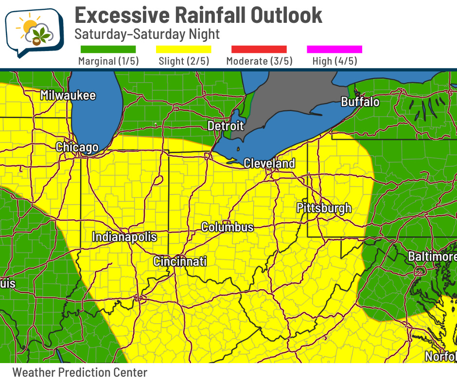 Yet again, storms could drop locally heavy rain in a short time. The Weather Prediction Center has a wide swath of the region, including all of Ohio, in a slight (level 2/4) risk of excessive rainfall leading to flash flooding Saturday–Saturday night.