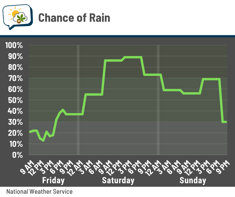 📈 Mostly dry today, higher rain chances this weekend