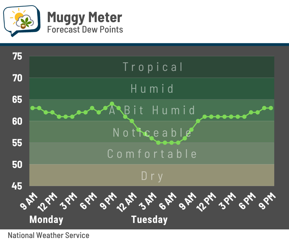The weather today and tomorrow are what we’ve been waiting for. The mugginess won’t be a pain in the butt (or a swamp in the same place, for that matter). Check out Tuesday morning — dew points in the 50s, something we haven’t enjoyed in foreverrrrr.