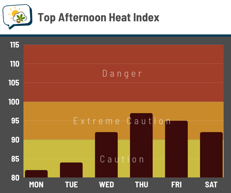 Peak heat indices Thursday and Friday should be around 95 or a smidge higher. That’s high enough that, if you’re spending a while outside, you’ll need to be mindful of preventing heat-related illness by taking more breaks and ensuring you’re hydrated.