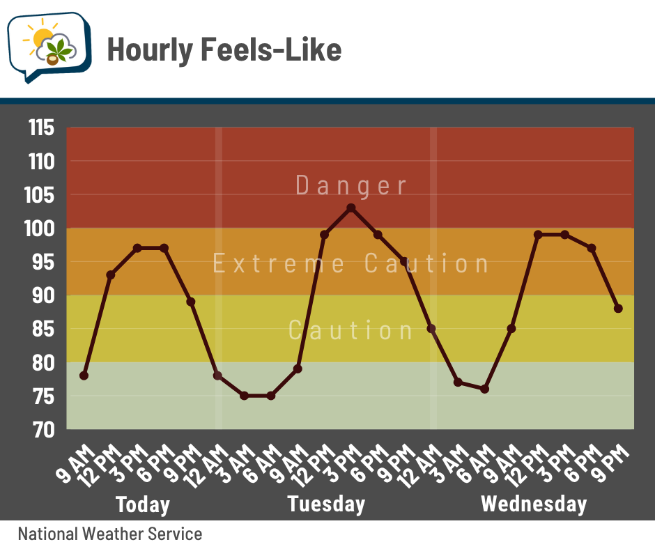 We’ll end up near 90 this afternoon and maybe a few degrees above that tomorrow and Wednesday. And stop me if you’ve heard this one before, but it’s still muggy! That’ll shove the heat index well into the 90s the next three days, probably pushing 100 tomorrow.