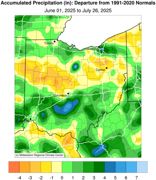 The southern half of Ohio (plus up around Lake Erie) have been relatively wet this summer. Columbus is officially a couple inches above average for rainfall. Some places south of the city have gotten at least four inches more than what’s normal through this point of summer.