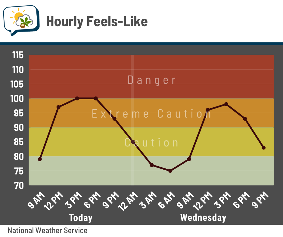 Today should be the warmest day of the week with highs in the lower 90s and heat indices pushing 100 this afternoon. Tomorrow won’t be much better with highs around 90 and a heat index peaking in the upper 90s.