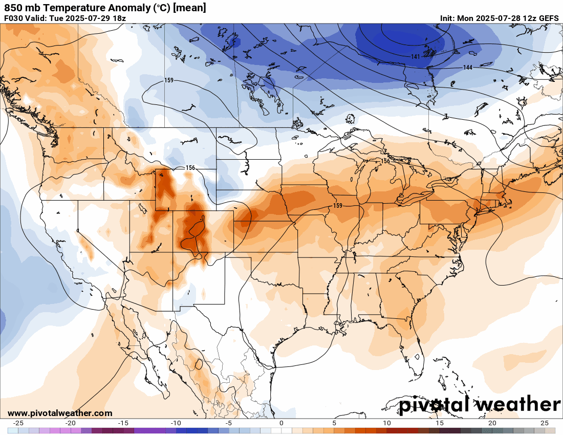 Here’s a look at the temperature anomalies in the upper-level pattern; orange is relatively warm, blue is relatively cool. You’ll see we’re in the warm pattern for now, but Canadian high pressure will send in nicer air for several days. The return of warmer, humid weather trying to edge back in may wait until closer to the second week of August.