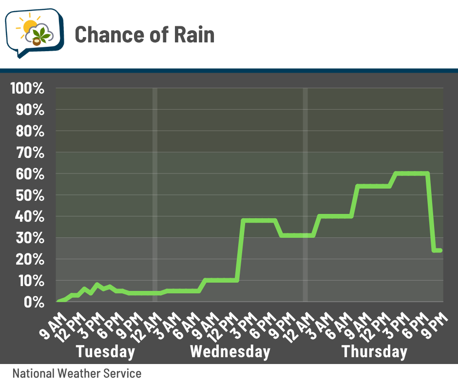 Better odds are here tomorrow afternoon into Thursday in association with the weather system that brings the cooler, drier air.