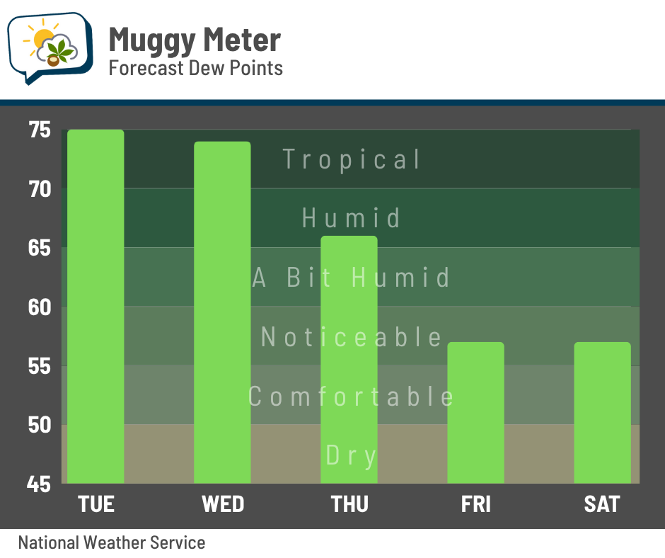 A cold front pushes across the state Wednesday through Wednesday night. Behind it, a change in our weather gradually takes over. After tropical dew points in the 70s the next couple of days, they’ll slowly fall during the day Thursday and eventually settle into much more pleasant 50s Friday and Saturday.