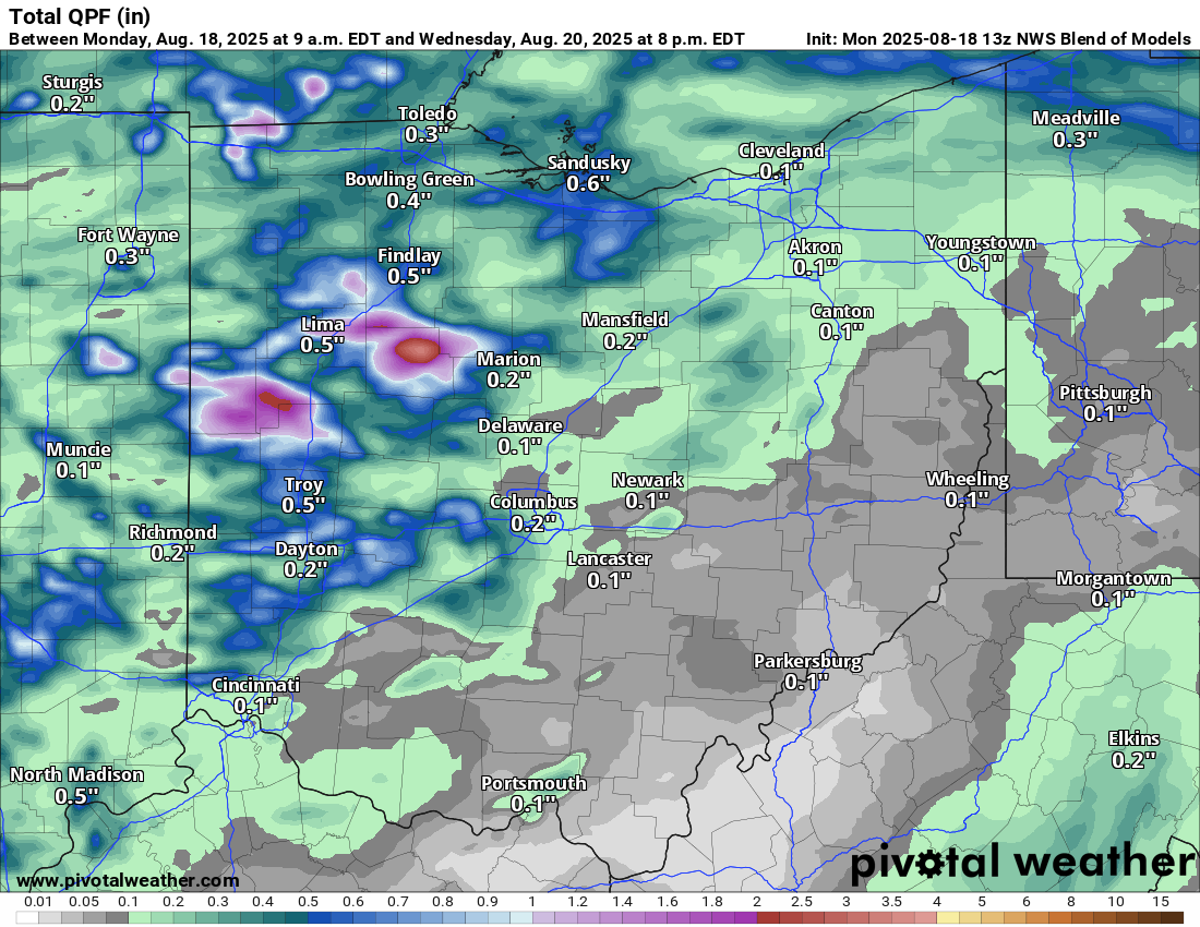 We don’t have a ton of deep moisture in place. While a brief localized downpour is possible, the ingredients aren’t as robust as they have been at other times this summer for getting a big dump of rain. Areas to our west and north have a better shot at a decent rain, a theme that the Blend of Models captures well.