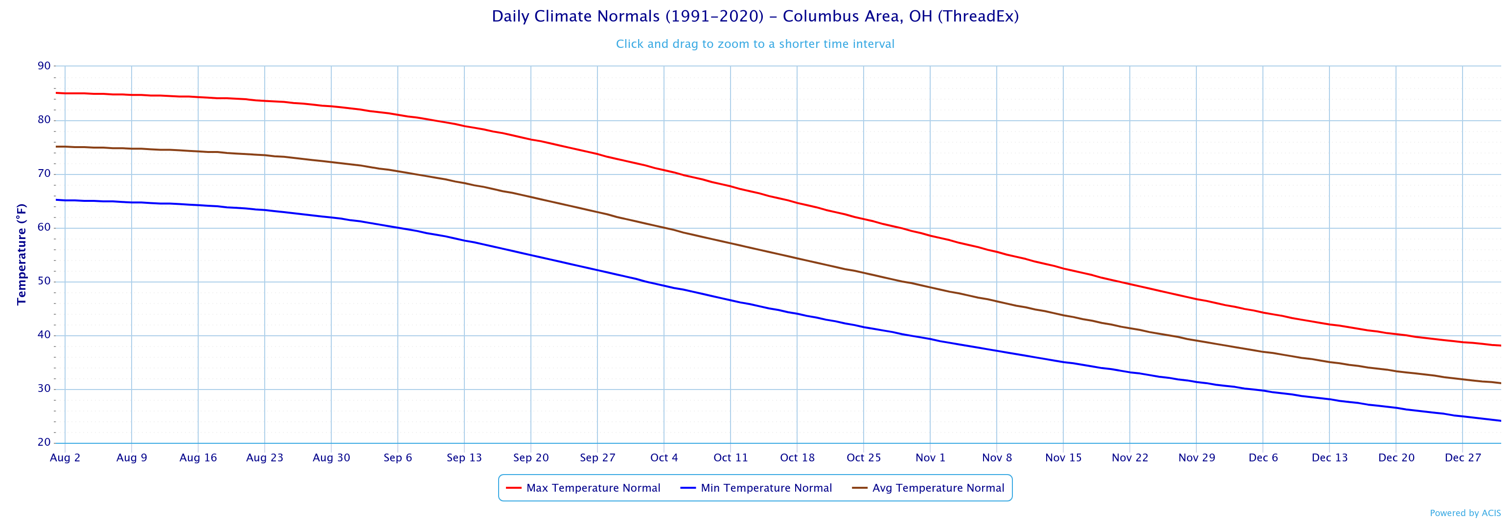 Here’s a graph of the normal temperature curves from August through December.