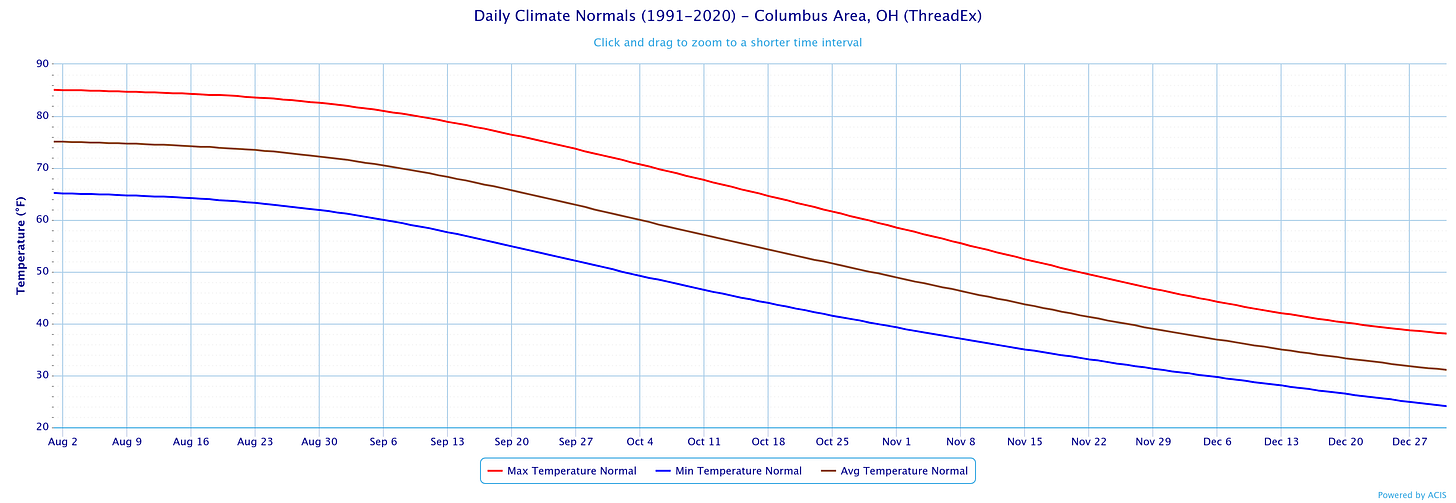 Next week is the final week of August, so it’ll be getting progressively harder for hot, humid weather to take over for more than a few days at a time. I’ll pull that thread in a newsletter later this week.