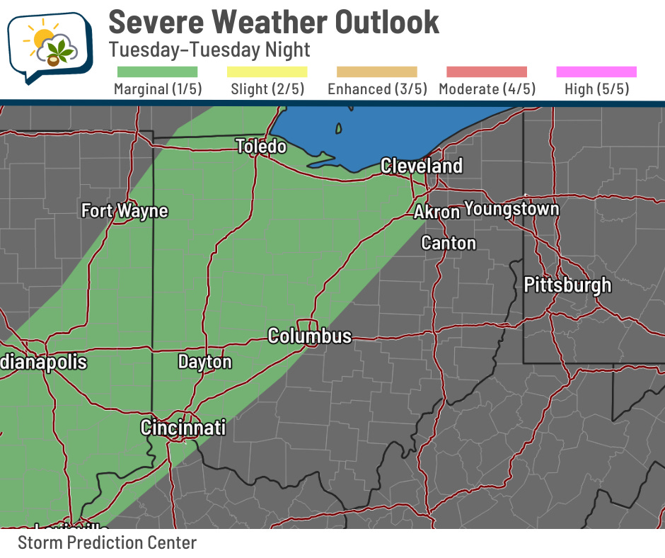Areas roughly along and northwest of I-71 were put in a marginal (level 1/5) risk of severe storms producing gusty winds. As things press farther east, they’ll lose the bit of oomph they might have… “might” being a key word.