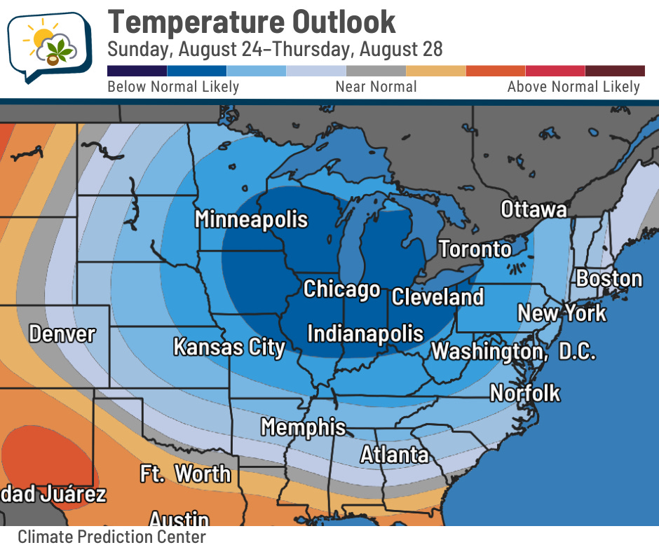 After that, the pattern changes and we see cooler and dry air take over for a while. There’s a lot of blue on the Climate Prediction Center’s outlook, covering the Midwest, Great Lakes, and beyond!