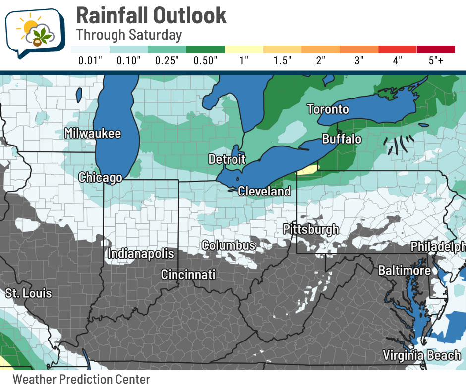 A disturbance carving across the Great Lakes on Thursday, in association with a cold front, brings another low-end chance of an isolated shower. Once again, odds strongly favor being dry. In fact, here’s the Weather Prediction Center’s rainfall outlook through Saturday:
