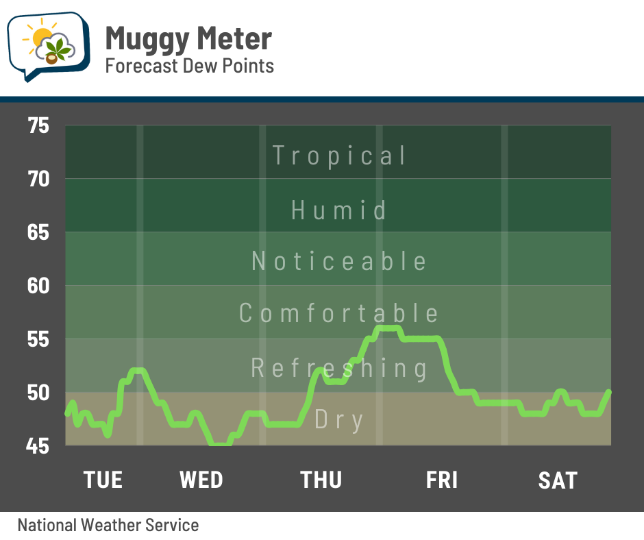 Second type of dry: the lack of humidity. It’s not just cool air we have in this Canadian airmass — it’s dry air, too. Check out the dew point forecast through the rest of the week. It sure is nice!