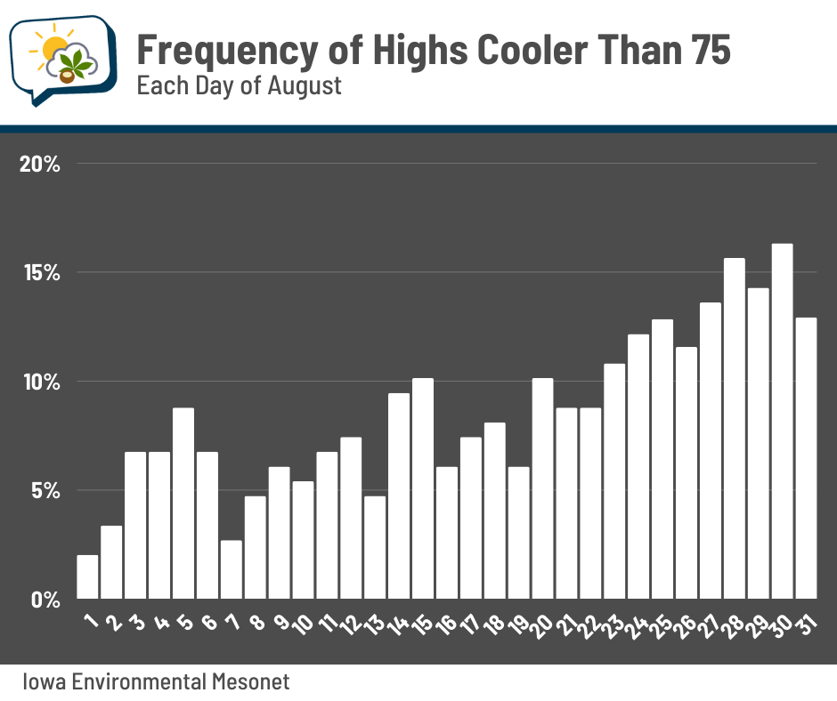We ought to stay below 75 degrees today, which will feel even nicer than yesterday. While the frequency of a high below 75 on any particular day at the end of August hovers near just 15%, that’s certainly an increase from early in the month.