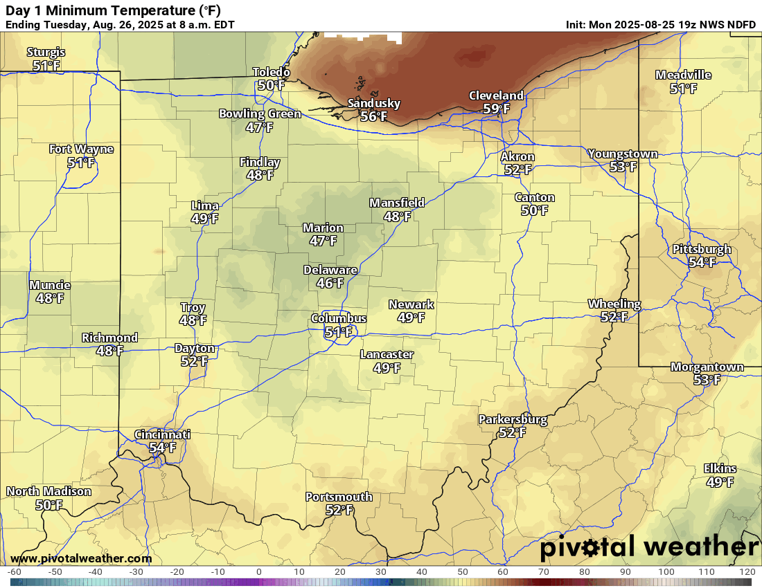 While Columbus proper might not quite drop into the 40s, it’ll be darn close if it doesn’t. Outlying areas far enough from the urban heat island should make it there, though. Upper 40s and even some mid-40s aren’t out of the question a ways from the Outerbelt.
