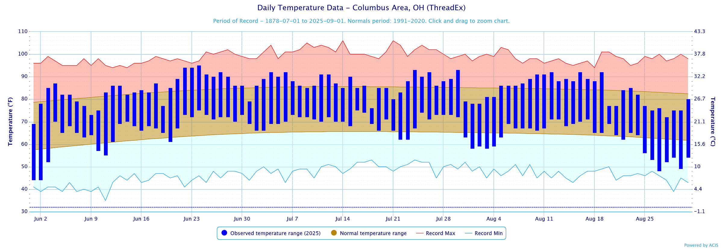 The graph below shows the daily temperature range (dark blue), compared to normal (brown) and records (red and light blue).