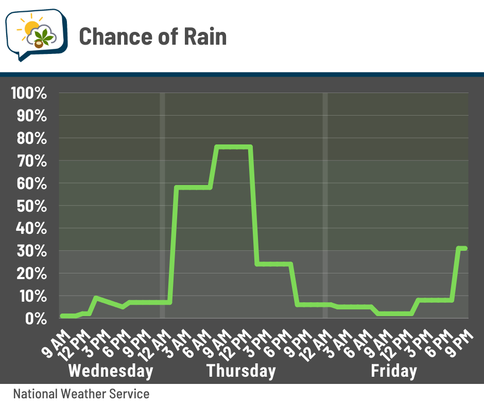 Rain won’t arrive until well after bedtime tonight, with the highest chances running from around daybreak through lunchtime. After that, the band of showers will peel away to the southeast with eventual clearing behind.