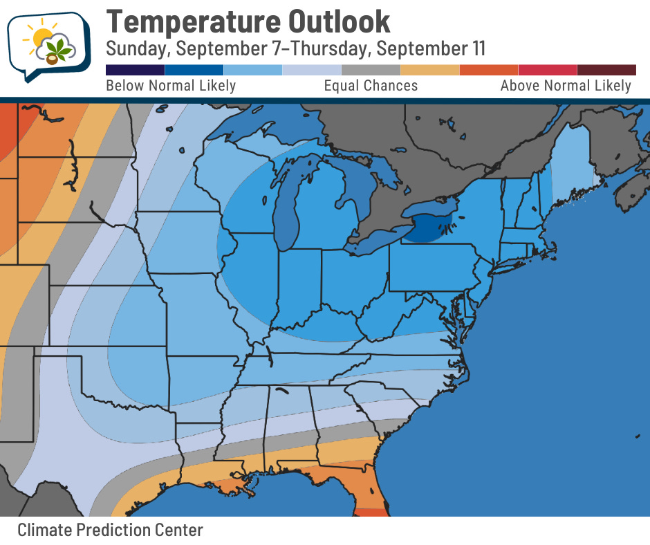 Below-normal temperatures roll right into next week. NOAA’s Climate Prediction Center shows that much of the eastern half of the country favors that pattern, with the highest odds in the Great Lakes region.
