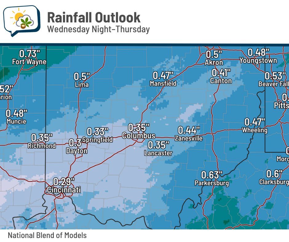 The National Blend of Models spits out an average of about a third of an inch of rain here in central Ohio. There’s pretty good agreement among various forecast guidance that we’ll get somewhere in that neighborhood, too.