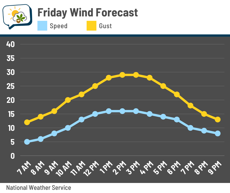 Ahead of that second cold front tomorrow, breezes will pick up from the southwest. Gusts of 20–30 mph are likely through the afternoon before dropping off during the evening.