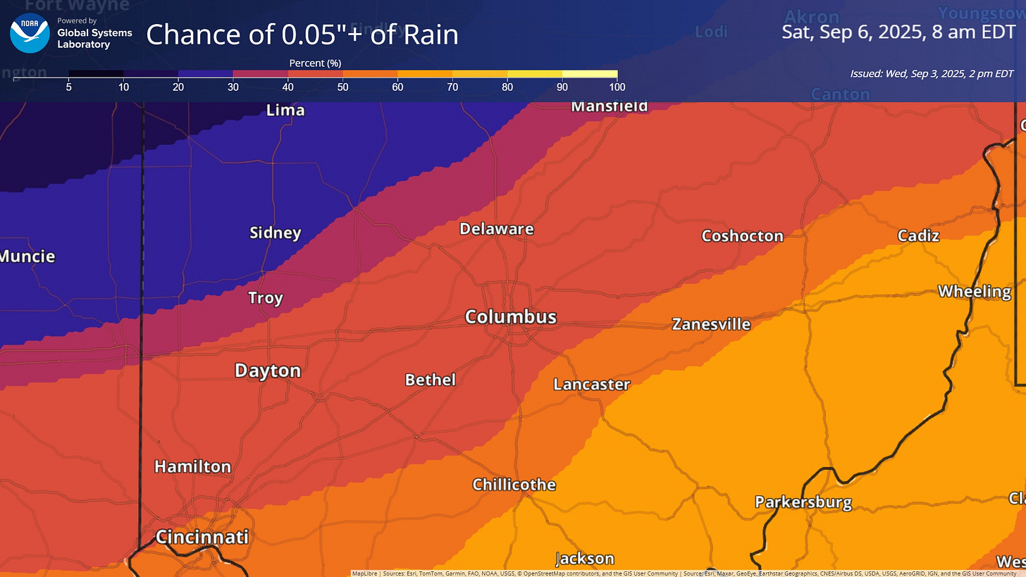 Another disturbance swings through tomorrow evening into Saturday, producing another opportunity for rain. The location of this one’s a little tricky, as it’ll come behind a second cold front. The I-71 corridor is currently the rough dividing line between the have-nots to the northwest and haves to the southeast.