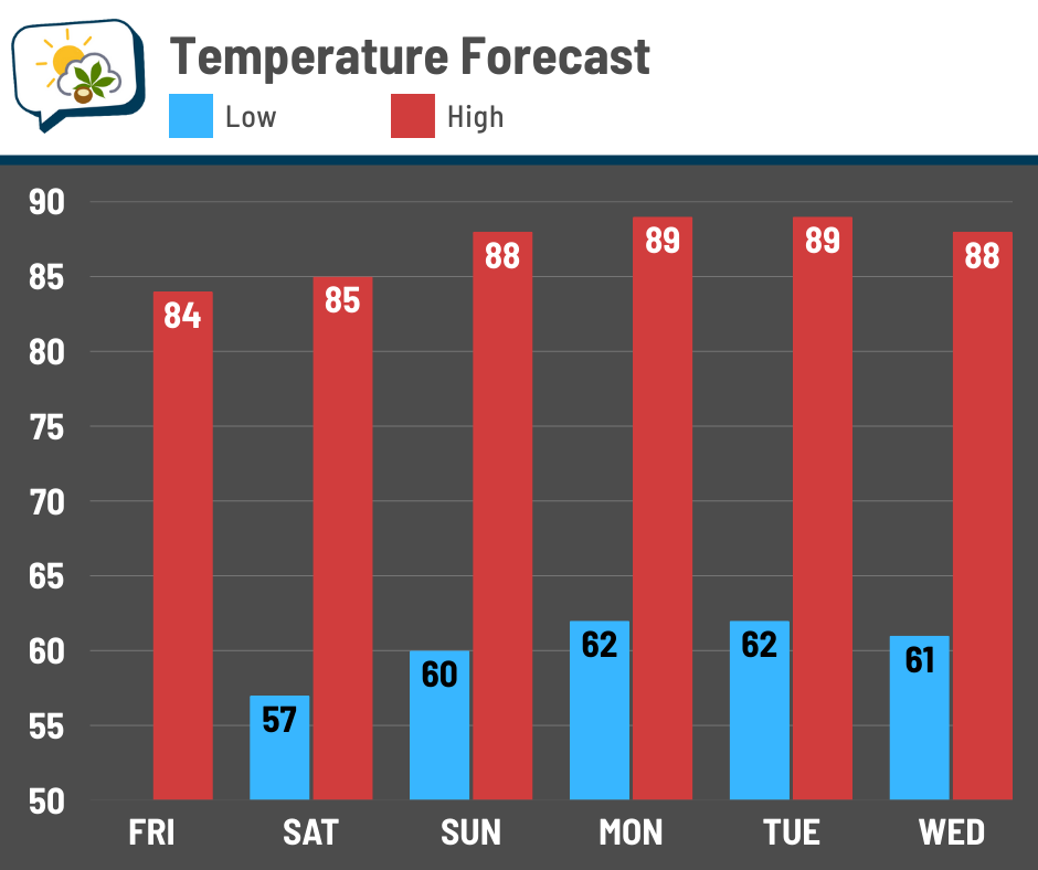 The seasonably large range between the morning low and afternoon high we’ve had lately continues into next week. Early morning or evening walks will still be comfortable, but you’ll feel the warmth if you’re out from late morning through mid-afternoon.