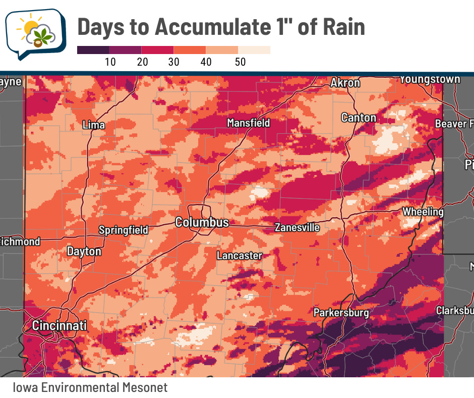 For much of central Ohio, that number is easily at least 30 days. A pretty good chunk of Franklin County even requires 40-plus days to accumulate one inch of rain.