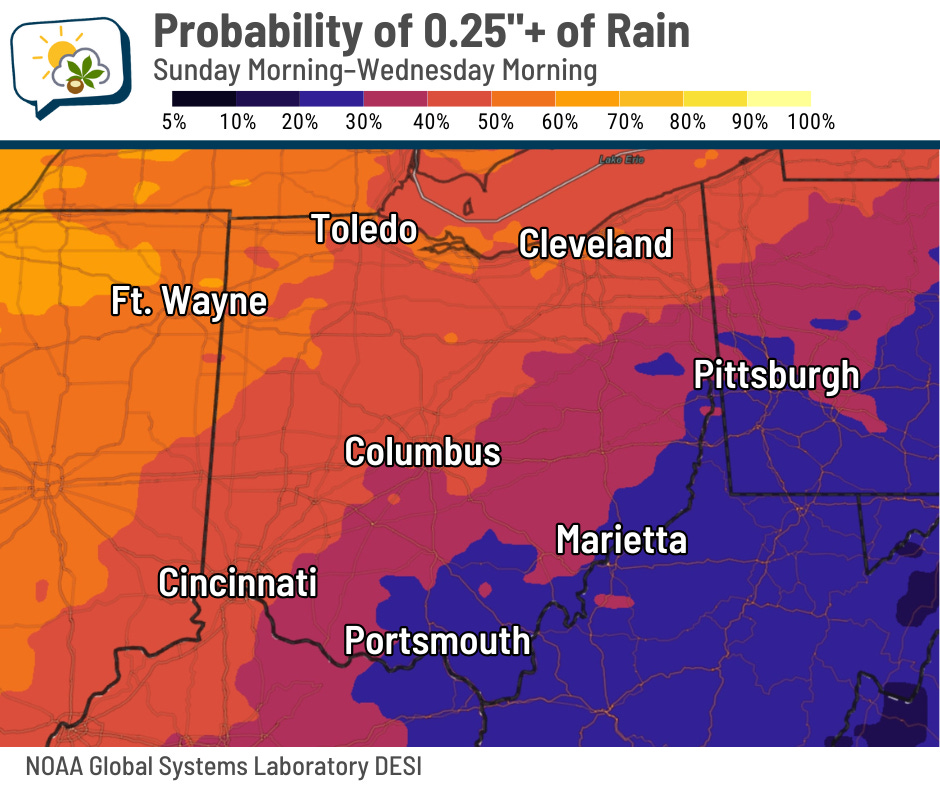 This is the National Blend of Models’ odds of getting at least a quarter-inch of rain in the 72 hours between Sunday morning and Wednesday morning:
