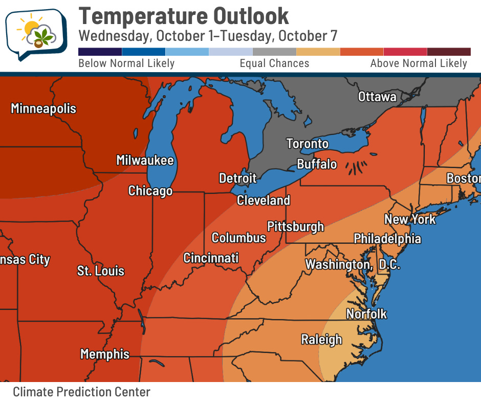 The normal high in the first week of October is in the lower 70s, so it doesn’t have to be particularly warm to be above average. Even so, if you’re looking for crisp weather… you’ll be waiting a while.
