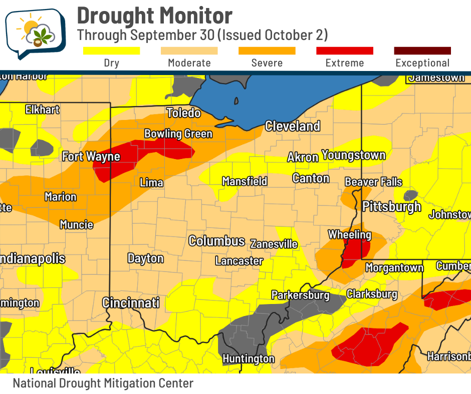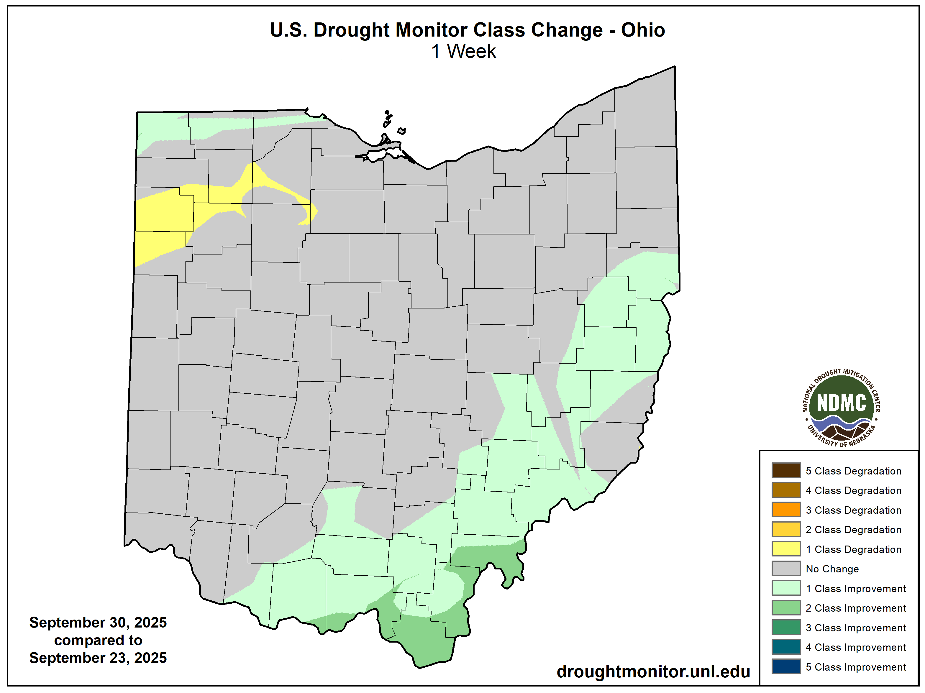 Northwest Ohio worsened into extreme drought, while rain in southern and eastern Ohio improved their situation.
