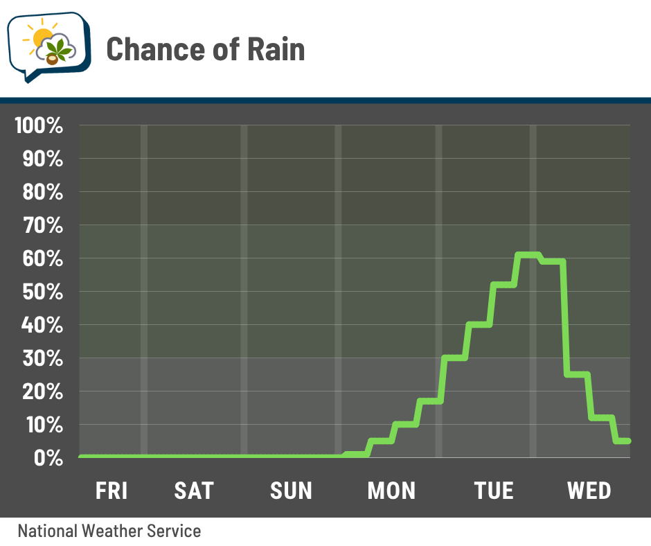 The system that ushers in cooler air next week is still on track to give us rain! Odds favor the Tuesday–Wednesday period. The timing of the cold front isn’t set in stone this far out, of course, but trends have favored late Tuesday into Tuesday night for the bulk of the activity.