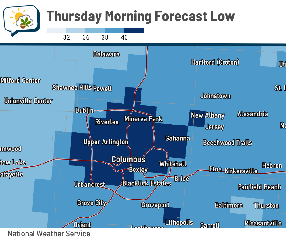 Friday morning looks to be similar… near 40 around Columbus proper while outlying spots drop into the 30s.