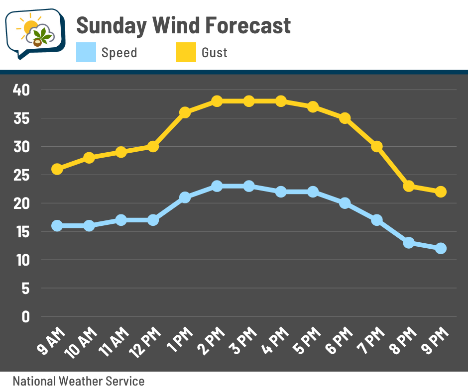 Sustained winds will be blowing along at 15–25 mph with gusts over 30 mph. They should be strongest in the afternoon and early evening.
