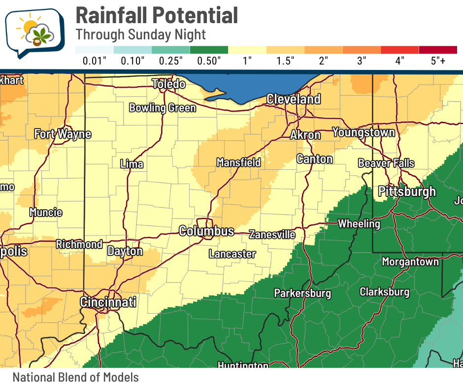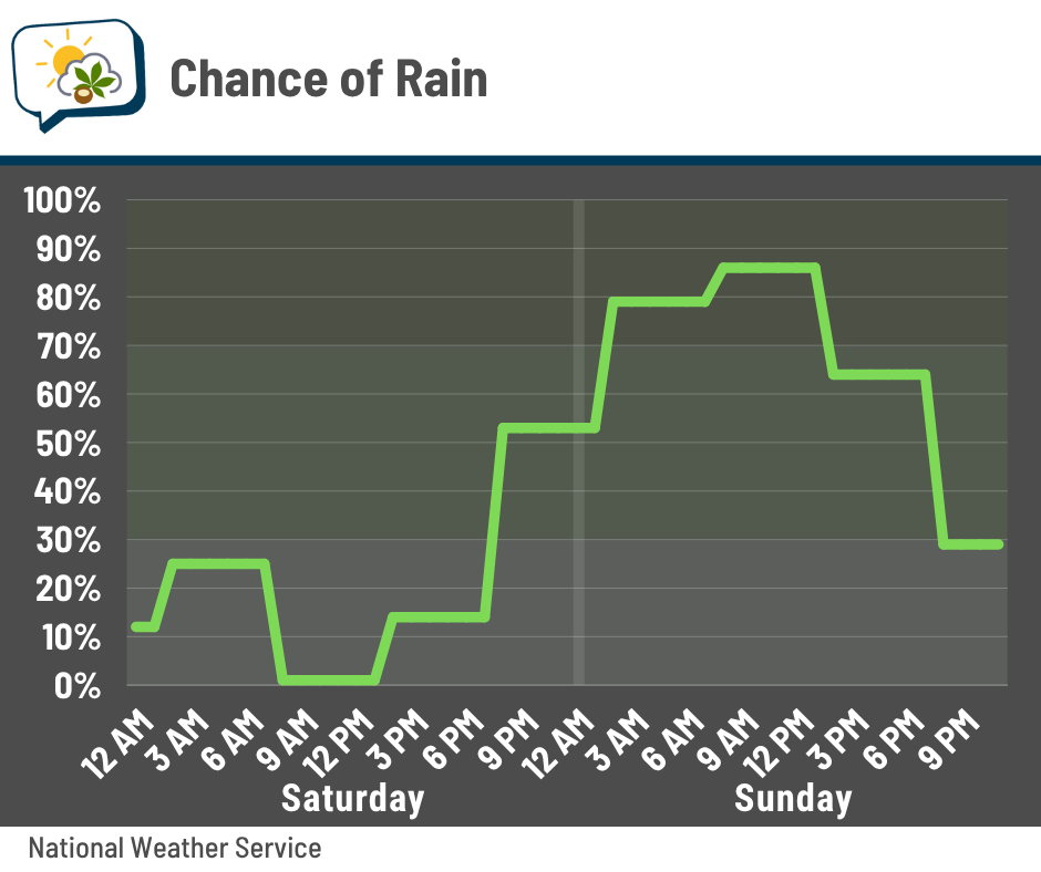 There’s still a low-end chance of a sprinkle or light shower early Saturday, but the bulk definitely waits until Saturday night into Sunday.