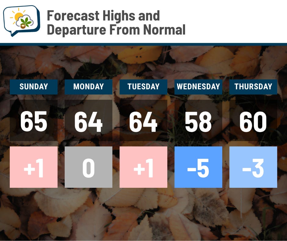 Highs early next week should be locked in the mid-60s. Another weather system passes on Tuesday, which brings a chance of showers and a reinforcing push of cooler air.