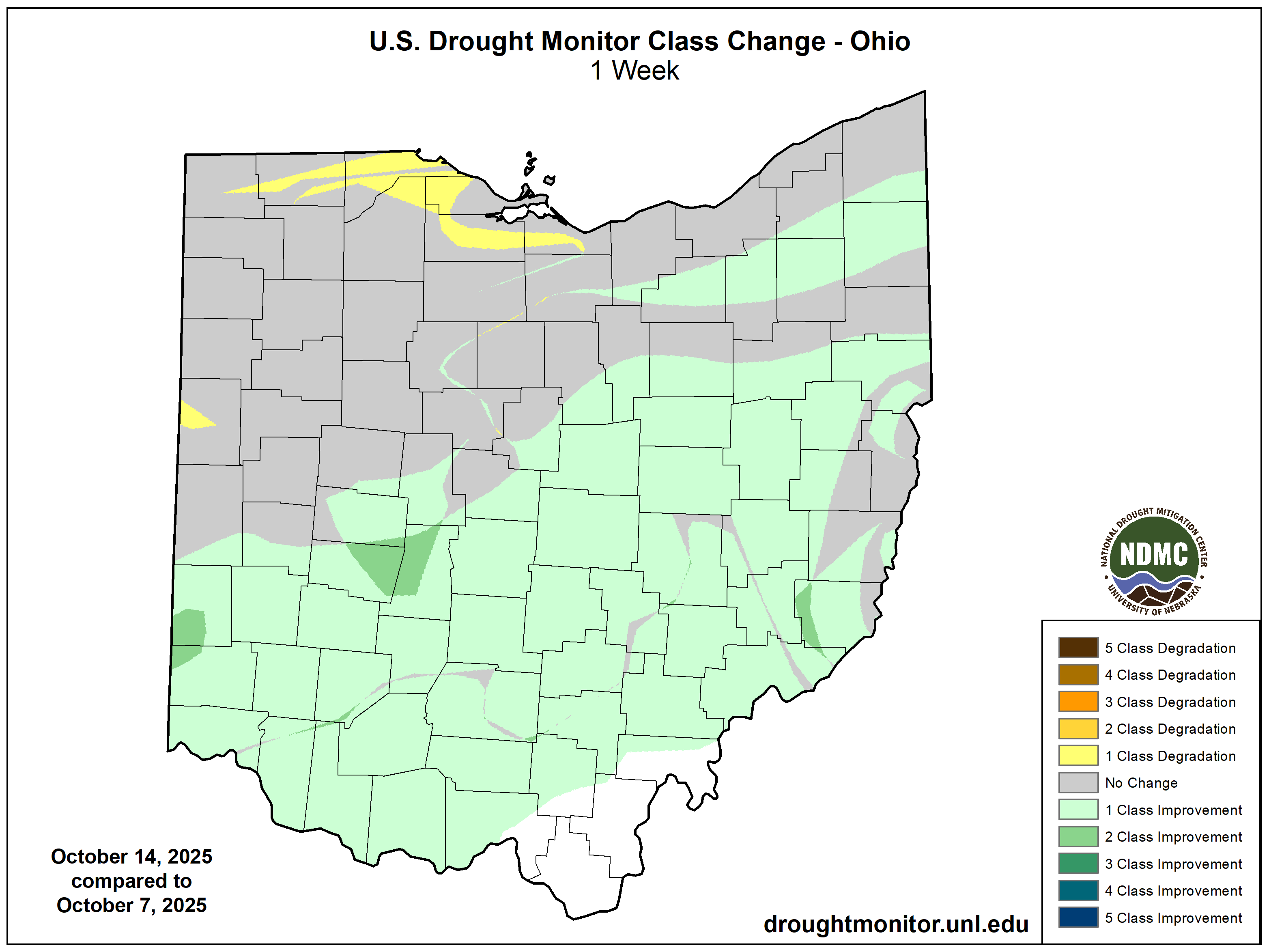 A large part of Ohio saw drought conditions improve by one category, with some pockets even jumping two categories. In fact, the amount of the state in moderate drought or worse was halved from the previous week, going from 73% to 37%.