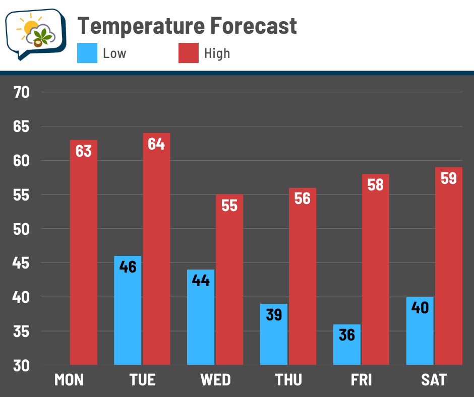 Friday morning should be the coolest of the bunch with lows in the mid-30s. We’ll certainly need to watch for frost risk that morning.