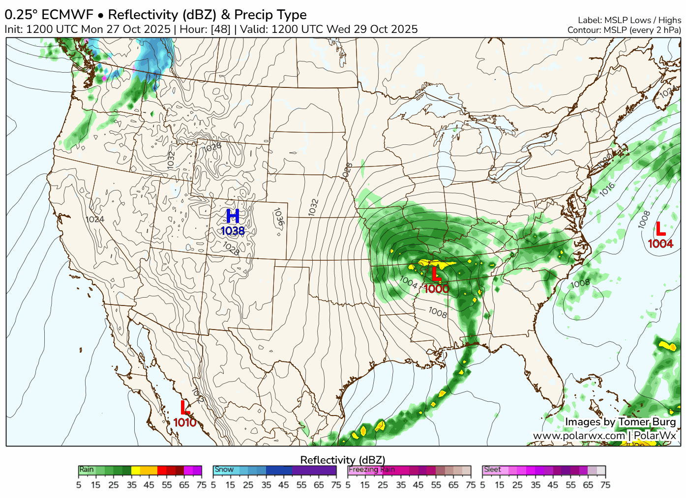 Here’s how the European forecast model plays things out, showing the low pressure system and the forecast radar.