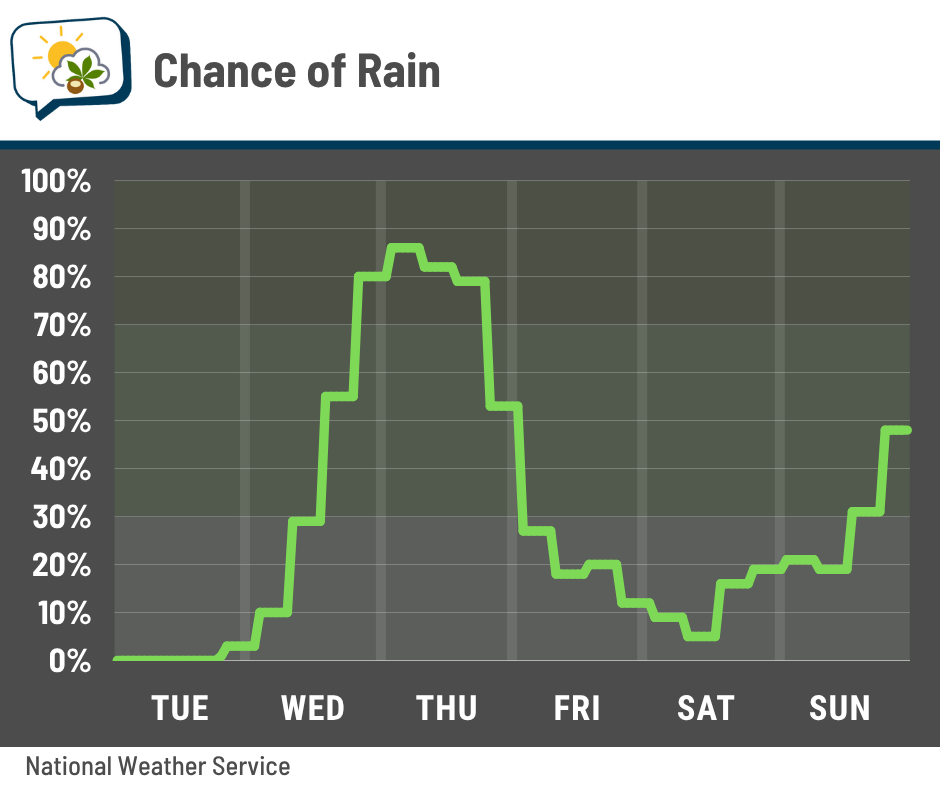 Rain spreads in from the south on Wednesday, with the best chance coming in the afternoon and especially evening. Rain remains likely on Thursday, perhaps starting to become lighter and somewhat more scattered in the evening… maybe. I hope it does, so I am not soaked carrying an umbrella over our trick-or-treater.