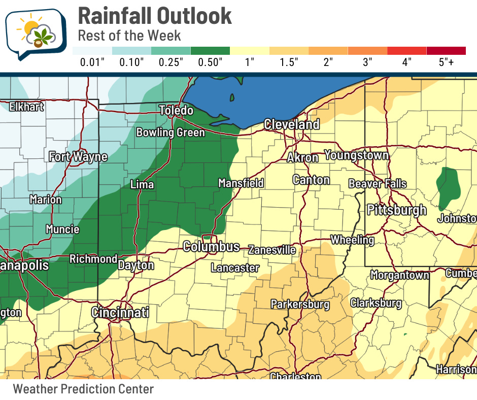 Chances are pretty good that we’ll see rainfall in the neighborhood of an inch. This will continue helping remove some of the lingering dry conditions in central Ohio. Unfortunately for the drought-stricken parts of northwestern Ohio, rainfall amounts will be less there.