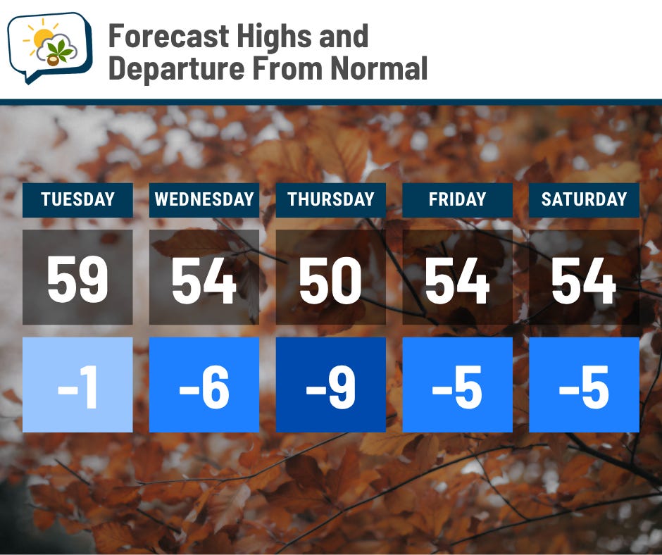 Today’s going to be pretty close to average. After that, cool air dominates. Thursday’s forecast of 50 could be a struggle to reach; I wouldn’t be surprised if I have to pull that down a little further.