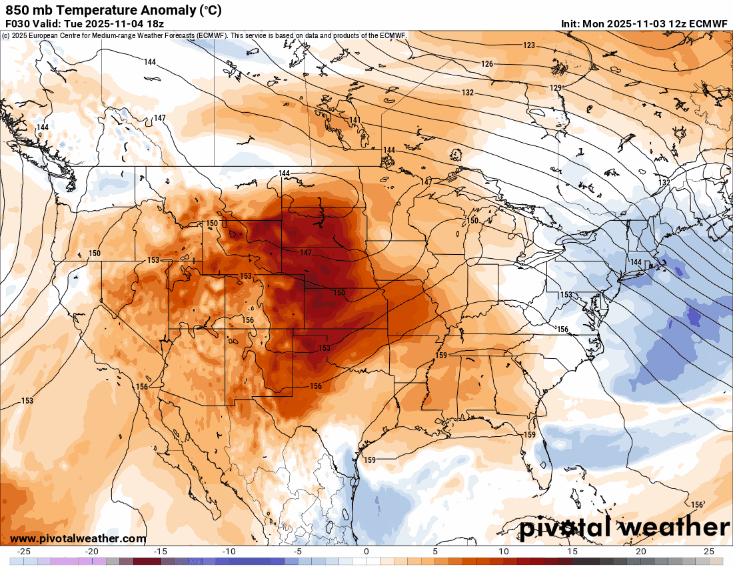 Below is the European forecast model of temperature anomalies about a mile up, which serves as a nice way to get a sense of airmass trends here. We have a couple bouts of relatively mild air that swing through tomorrow and Friday (highs in the 60s); otherwise, it’s fairly close to average.