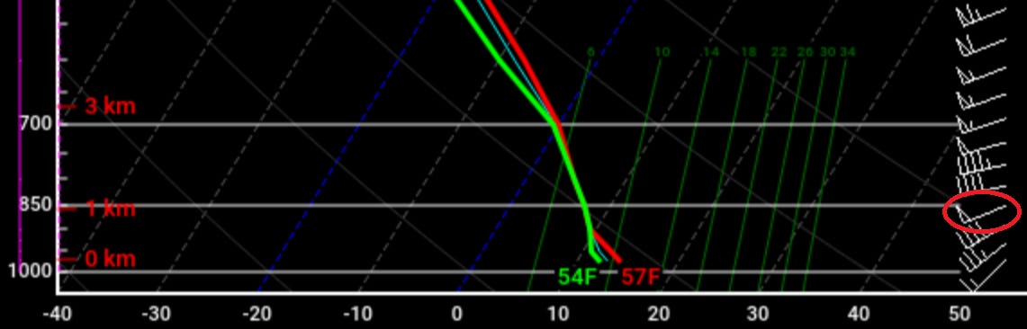 I’ve noted the 50 knot wind barb in the image below. 🤓 Nerd alert… this is a “forecast sounding.” It’s basically “what does the model think a plot of weather balloon data would look like at this time and place?” It shows temperature (red), dew point (green) and wind barbs (right-hand side) with height.