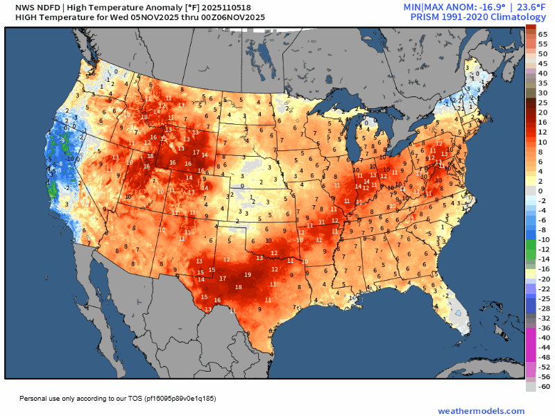 Here are the forecast high temperature anomalies through next Tuesday. You start to see the chill emerge in the Northern Plains and parts of the Upper Midwest on Saturday, then spill south and east. It’ll dominate essentially the entirety of the country east of the Rockies on Monday.