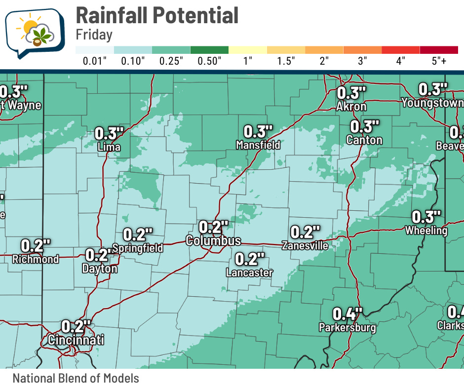 Rainfall amounts have continued to trend downward, with most guidance settling toward a quarter-inch or a bit more.