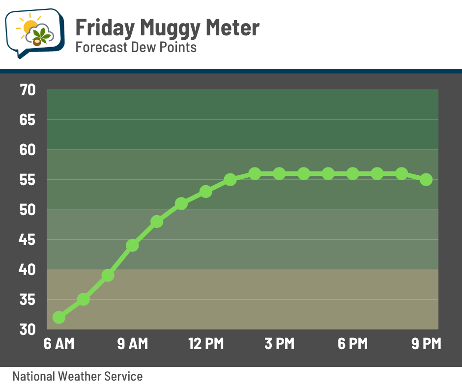 Check it out — dew points jump into the mid-50s for the afternoon and evening.