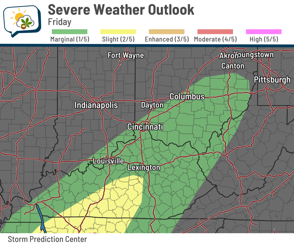 We could also manage a rumble or two of thunder. The Storm Prediction Center even had roughly the southeastern half of Ohio in its marginal risk (level 1/5) of severe weather in the outlook issued yesterday, with higher odds to our southwest in Kentucky and Tennessee. (Check the latest outlook here, since it’ll have been updated since I wrote this.)