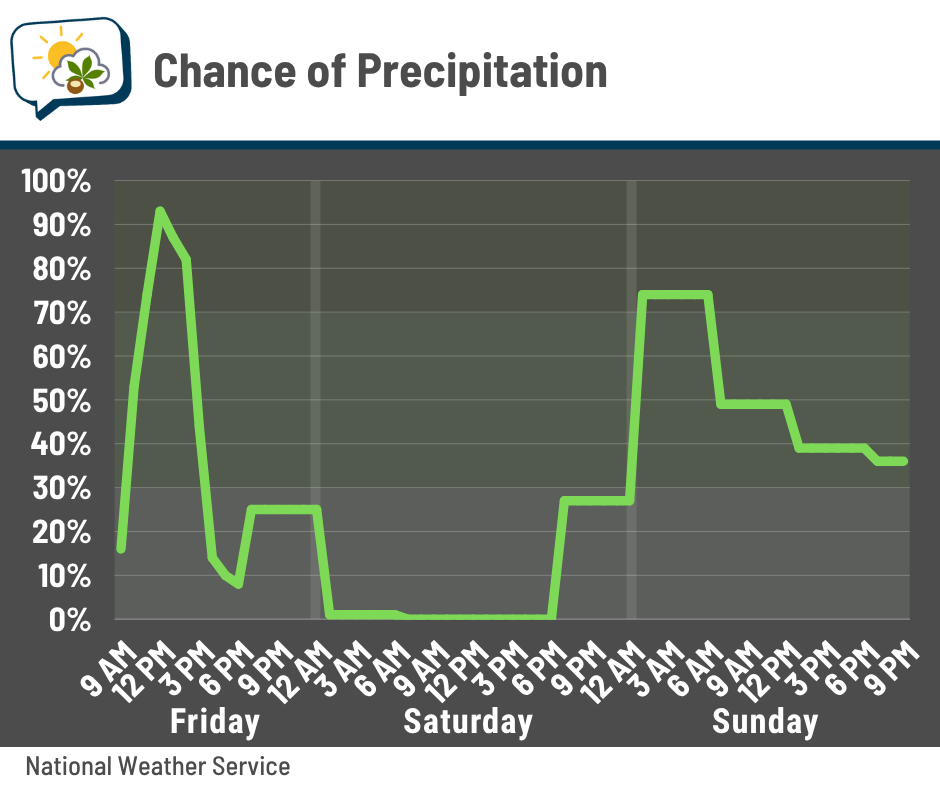 Regarding the rain, today will not be a soaking, sopping wet day. The nature of the rain looks to be showery and intermittent, but we have a decent chance anytime from later in the morning through late afternoon.